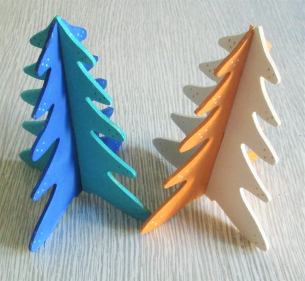 J’ai peint chaque côté des sapins de deux coloris, bleu et turquoise et doré et blanc.