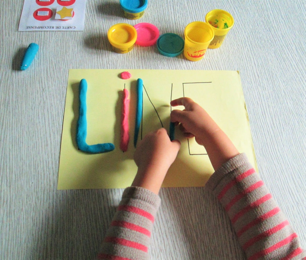 Rien de plus facile, il vous suffit d’écrire un mot avec des lettres bâtons (évitez le B, le O et autres formes rondes), vous l’écrivez sur une feuille et vous montrez à votre enfant comment les serpentins en pâtes à modeler donnent naissance à un mot quand on les pose sur les lettres!