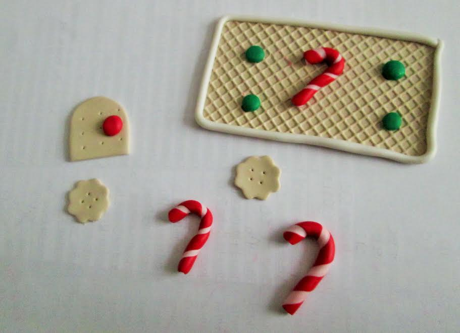 – Aplatir un autre morceau de Fimo Sahara et découper des formes pour faire des fenêtres en formes de biscuits et la porte. Vous pouvez utiliser les formes que vous voulez mais pour un effet réaliste, faire des trous à l’aide d’un cure-dent.