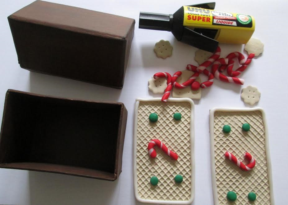 Matériel: Boite en carton maison, peinture acrylique marron, pinceau, Fimo soft sahara (70), Fimo effect rouge paillette (202), vert paillette (502) et nacre (08), cutter, emportes pièces, rouleau, feuille de texture (gaufre), colle, stylo, règle, mètre mesureur, papier.