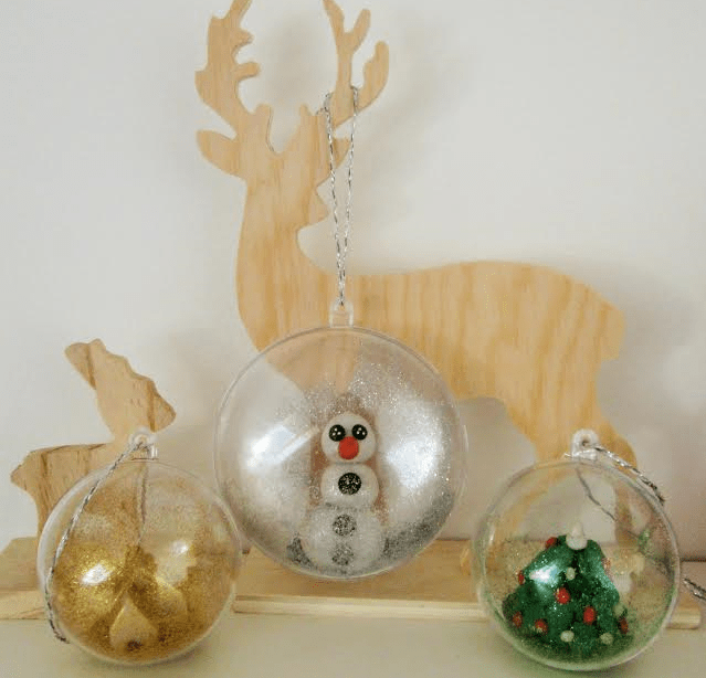 – Coller le bonhomme dans la boule. Puis, verser des paillettes assorties et coller les rebords de la boule.