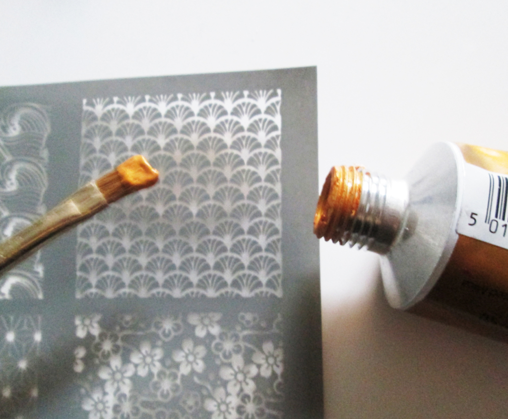 Poser le pochoir sur le nuage. J’ai choisi le motif géométrique. Puis, à l’aide du pinceau, déposer une fine couche de peinture acrylique dorée.
