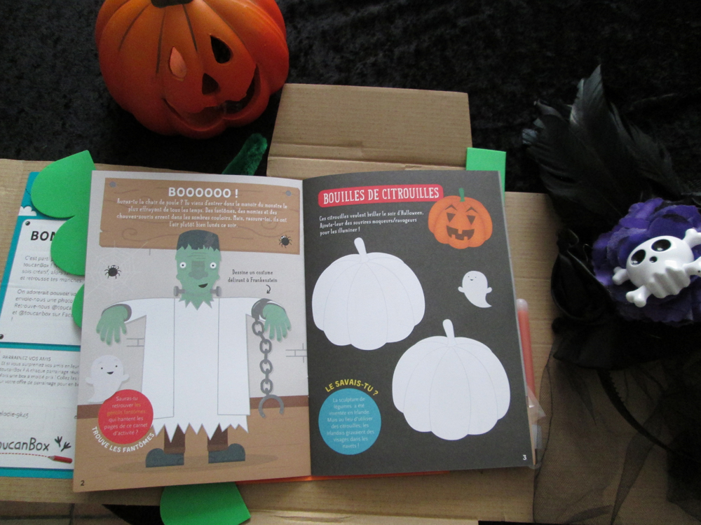 Et on retrouve le petit livre d’activités dans la box, avec histoires et même une recette, et des pochoirs Halloween!
