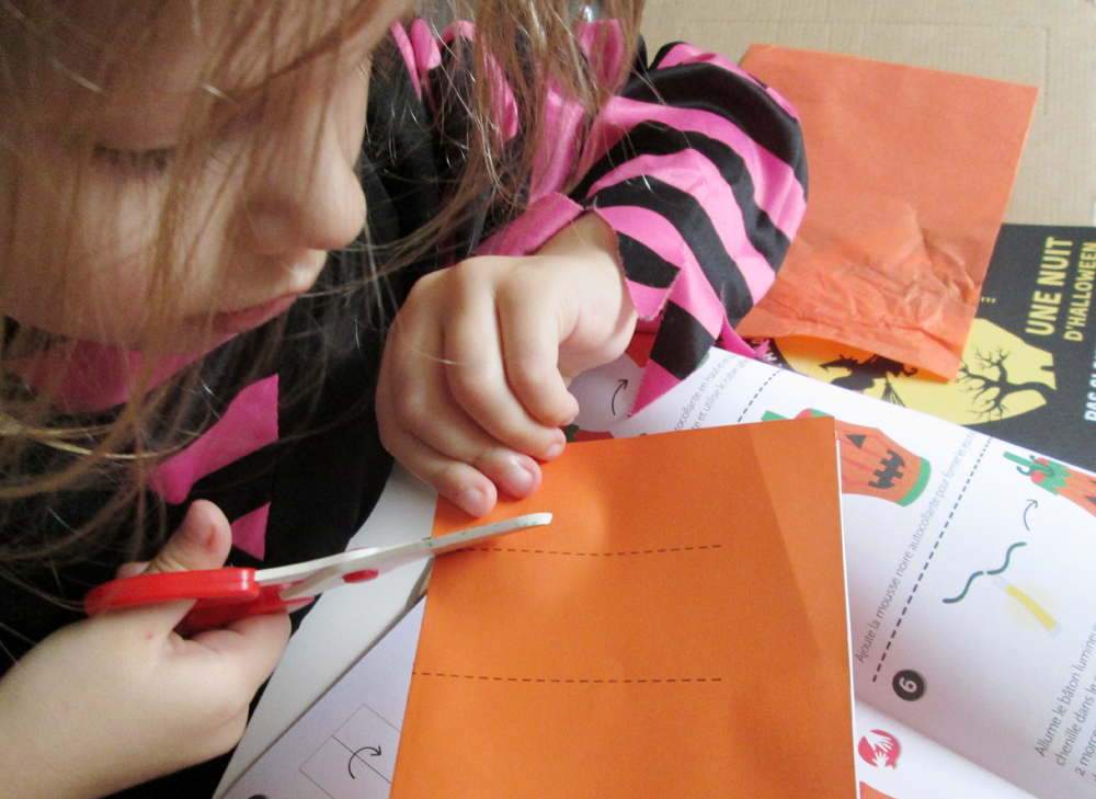 A l’intérieur, on trouve tout le nécessaire pour faire un lampion (ou un allumoir) citrouille pour déambuler le soir d’Halloween.