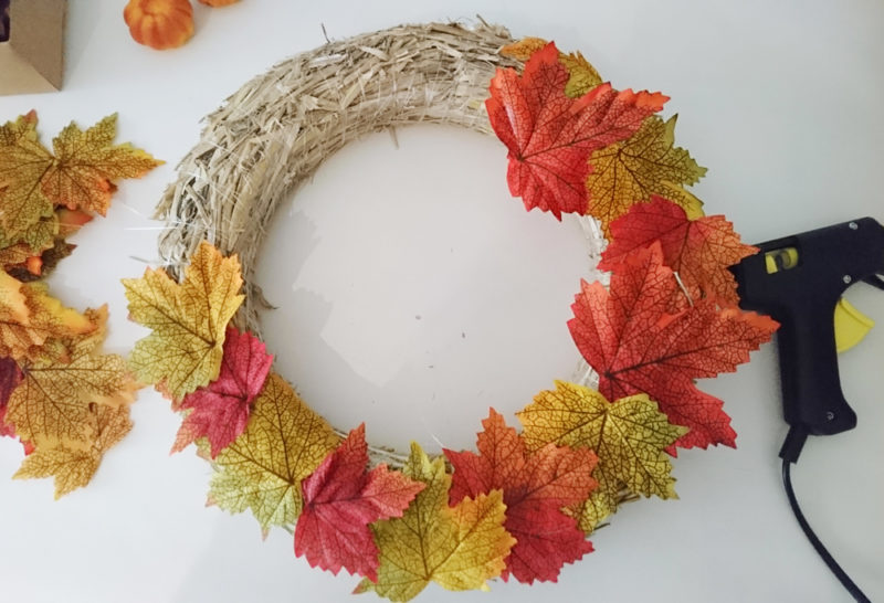 On commence donc par coller les feuilles une à une à l’aide du pistolet à colle autour de la couronne, sans oublier derrière et les côtés, pour éviter que la paille ne tombe et ne salisse votre intérieur.