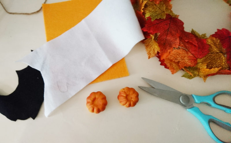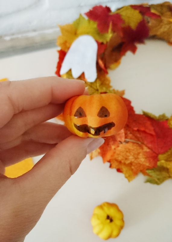 Et pour finir, Halloween sans citrouille, ne serait pas Halloween! J’ai donc découpé une citrouille dans de la feutrine orange et dessiné yeux et bouche au Posca. J’ai également utilisé deux petites citrouilles en polystyrène sur lesquelles j’ai dessiné également yeux et bouche.