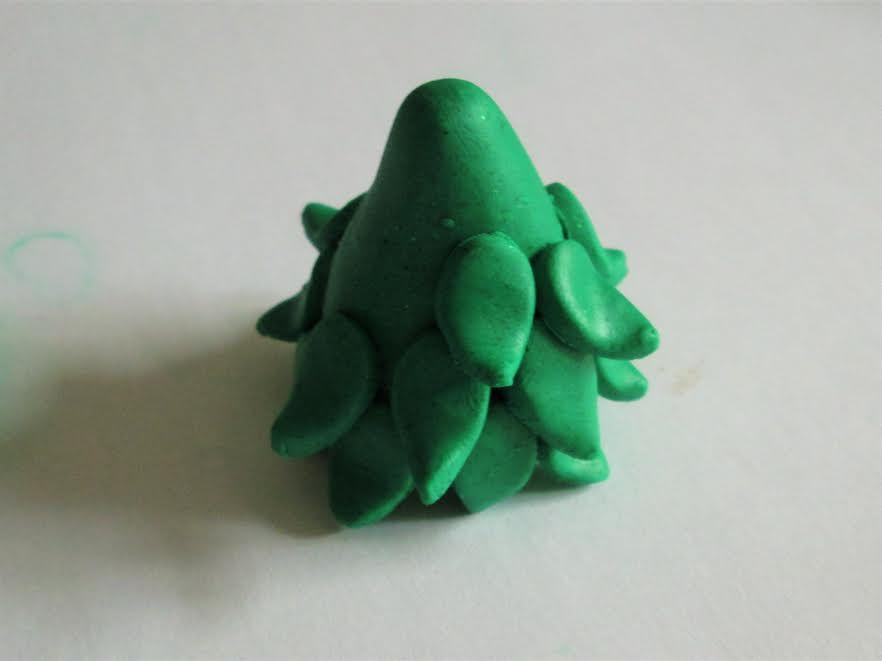 – Faire une boule avec la Fimo Effect Vert Paillette, bien malaxer. Former un cône.